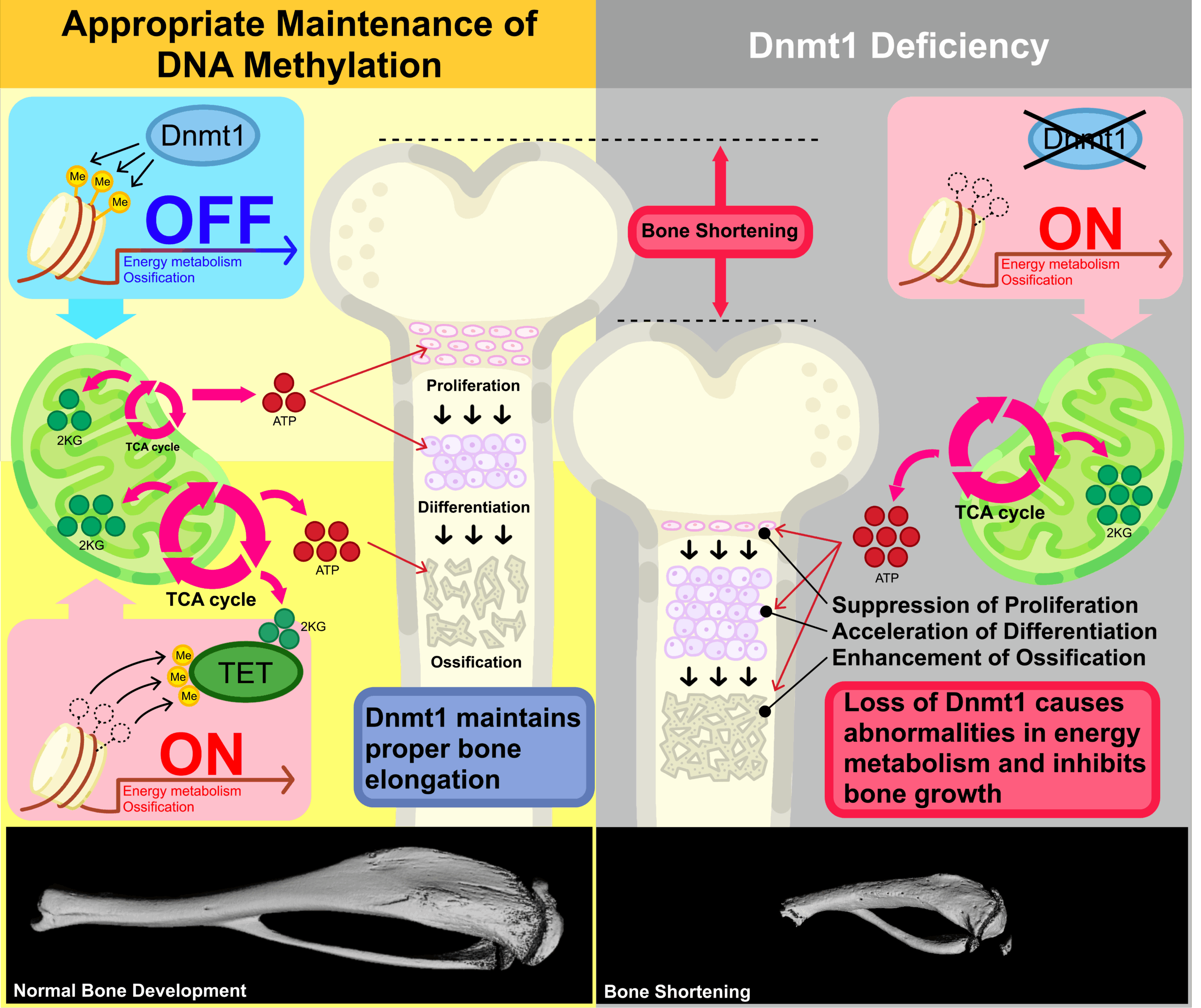Taken together, these findings reveal that Dnmt1 regulates energy metabolism to ensure proper chondrocyte maturation and normal bone elongation. This discovery highlights the potential of nutritional and metabolic interventions in the prevention and treatment of impaired bone growth and osteoarthritis.